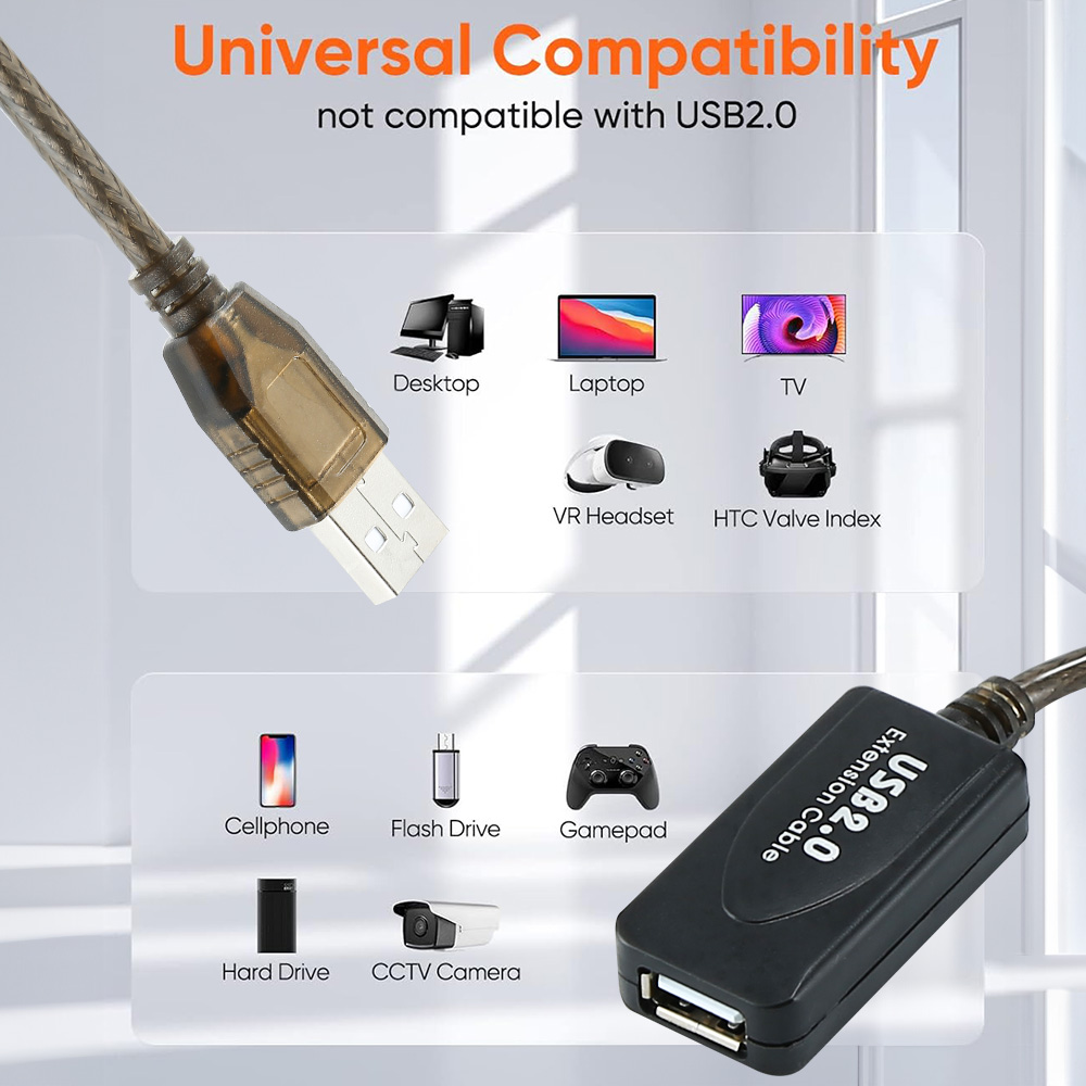 - ã€FLEXIBLE&DURABLE】: With metal wire braid inside, the cable is flexible and resistant to pull and drag. The gold-plated connectors can bear more than 10000 times plug. The ABS and PVC case is anti-abrasive. UNIVERSAL COMPATIBILITY: The USB active extender is broadly compatible with Windows, Mac, Linux, Chromebook, and USB 2.0 peripherals including hard drives, USB hubs, mice, keyboards, flash drives, printers, and more.
